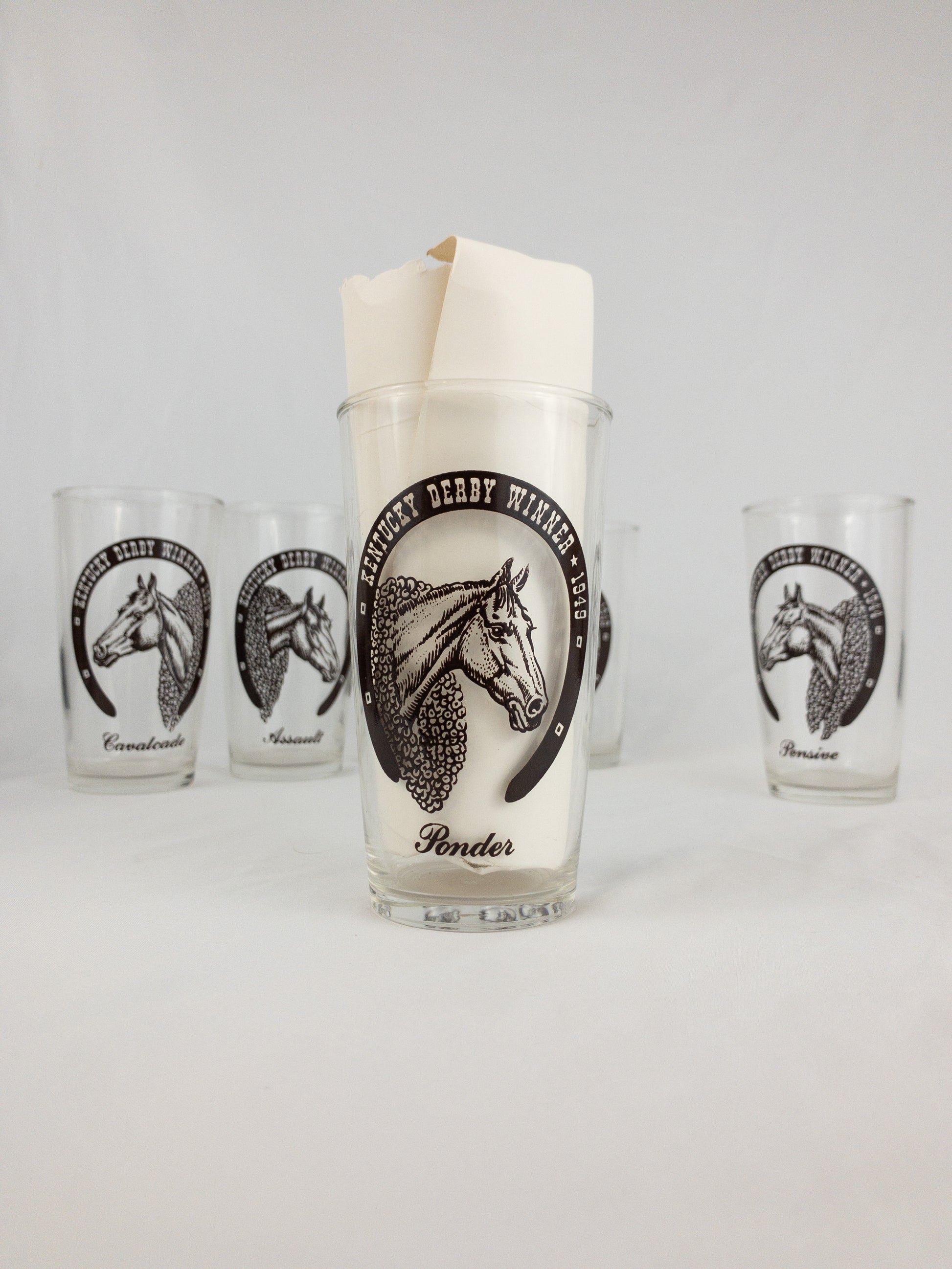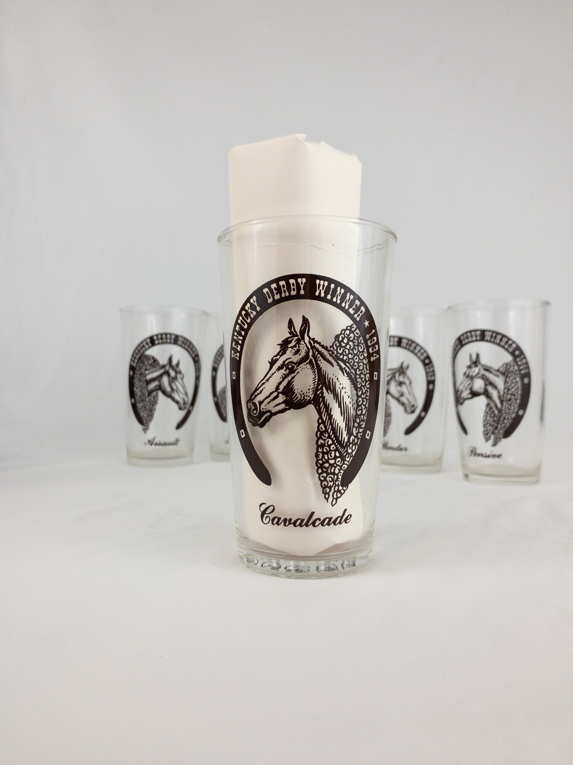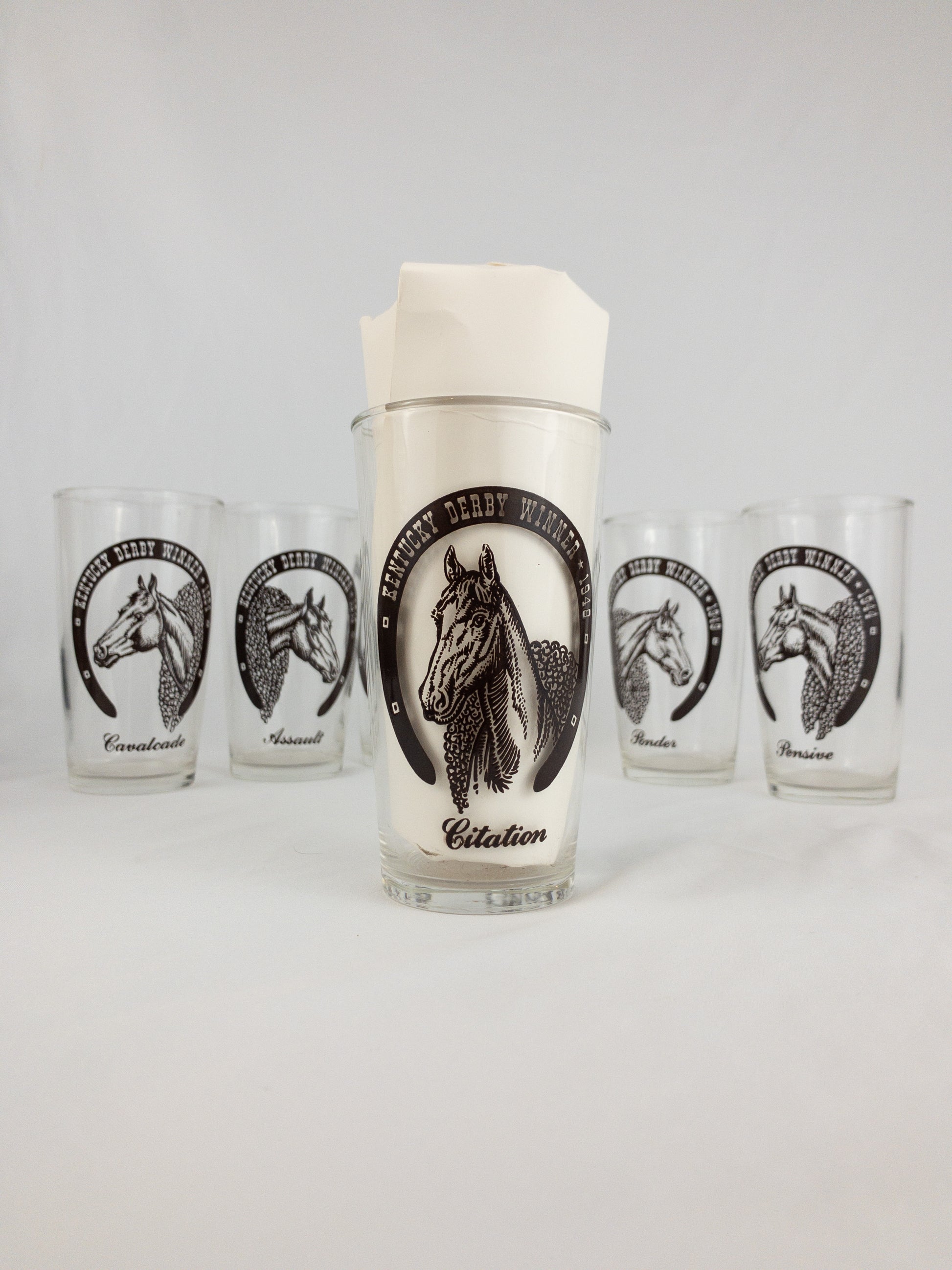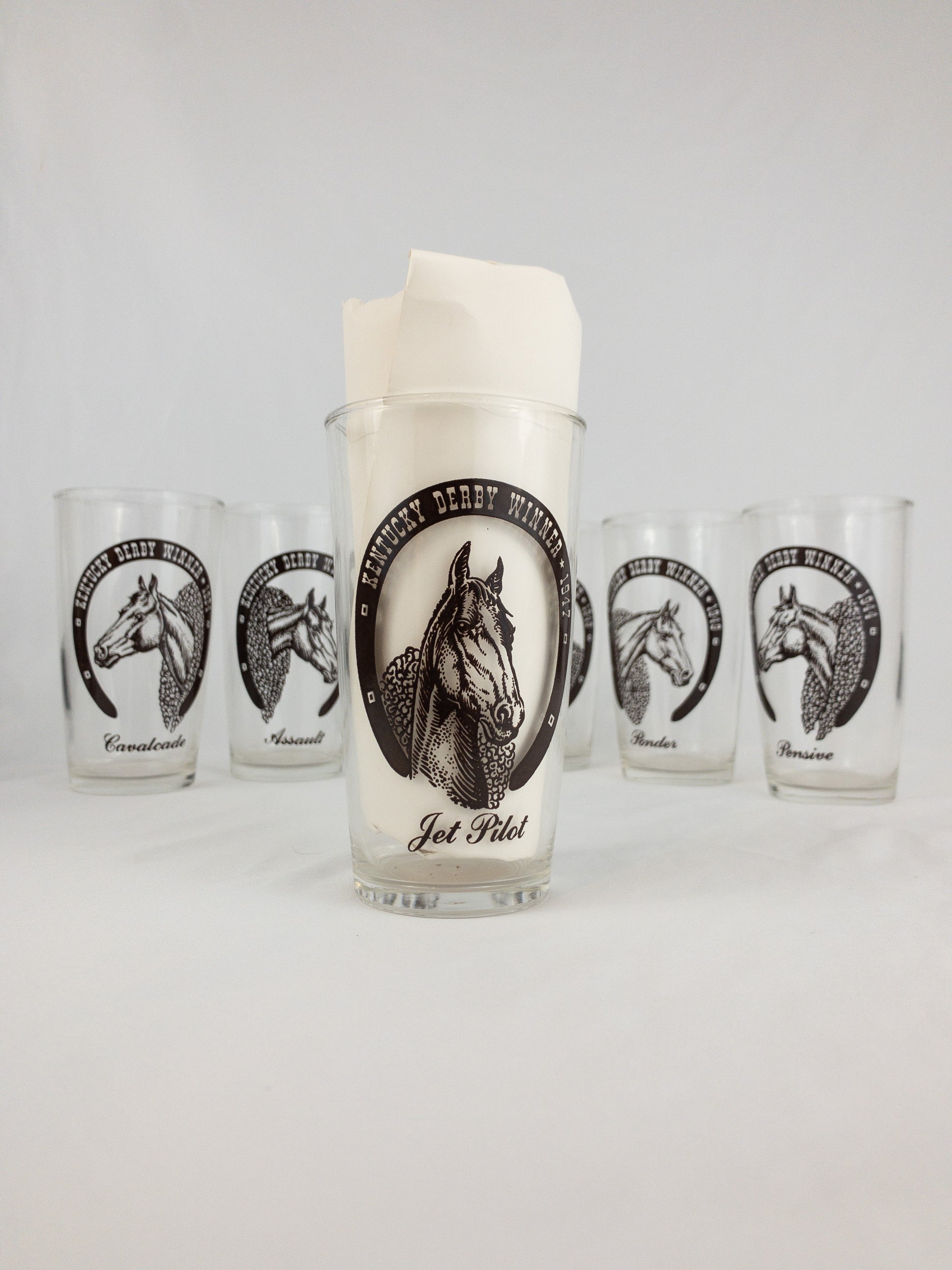 Drink set from the 1950s, set of 6. Showing the winning horse from 1934, 1944, 1946, 1947, 1948, and 1949 Kentucky Derby